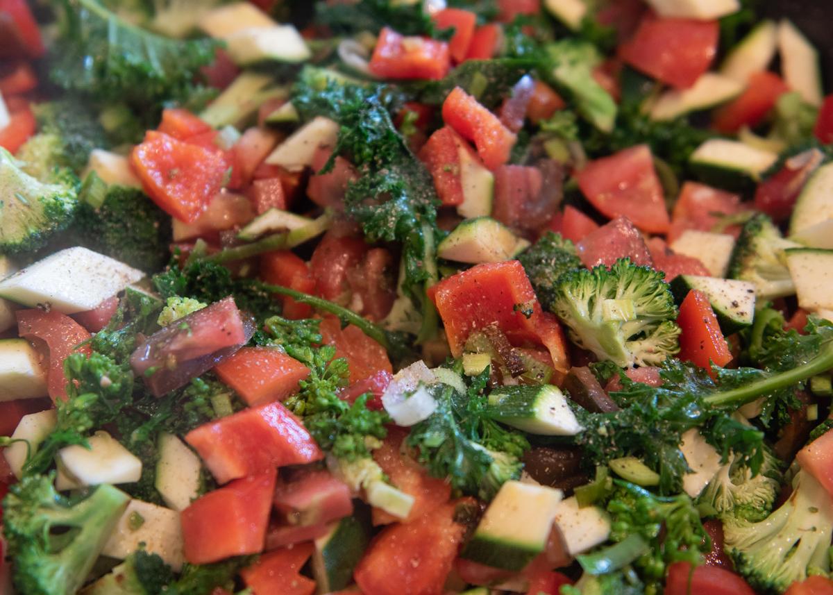 Brokkoli, Grünkohl, Zucchini und Paprika mit in die Pfanne geben